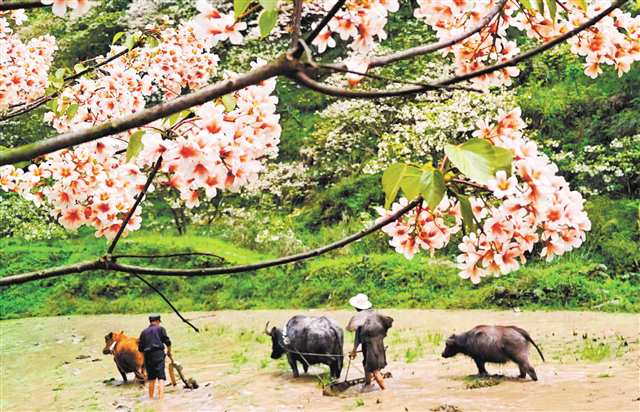 4月18日,酉阳县可大乡桐花岭,盛放的油桐花与传统农耕展示相得益彰,勾勒出一幅春日生态画卷。